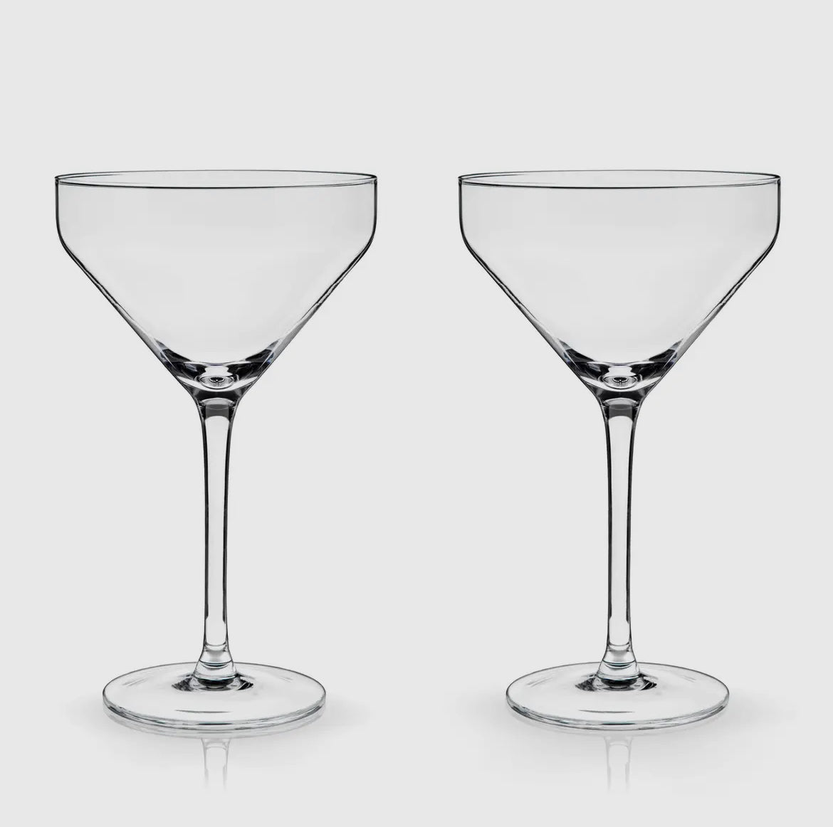 Featuring a sleek stainless steel shaker, two angled crystal martini glasses, gold-plated cocktail picks, and a jar of premium Spanish olives with the ideal brine-to-olive ratio — every detail is designed for style, function, and indulgence.