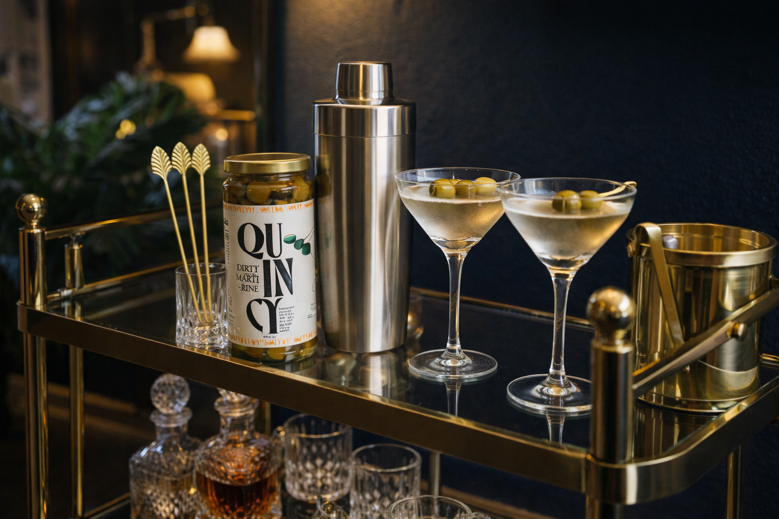 Spanish olives with premium olive brine by Quincy- the jar is perfectly balanced with enough brine to make up to 14 martinis.